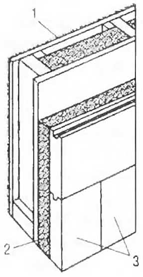 1 — легкая каркасная стена; 2 — утеплитель; 3 — стена из гипсовых плит.
