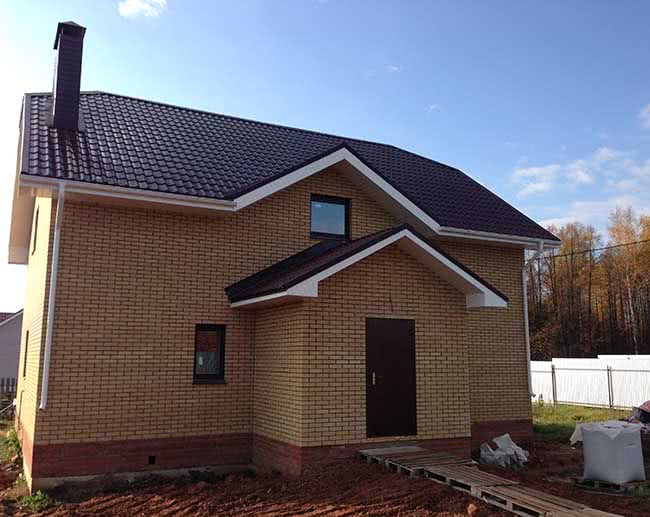 Несущая и облицовочная стены опираются на один фундамент. Наружный слой чаще всего выполняют либо из облицовочного кирпича, либо из строительного с последующим оштукатуриванием, покрытием искусственным камнем, клинкерной плиткой и прочее.