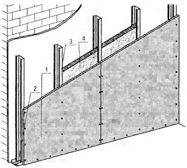 1 — гипсокартонные листы; 2 — профиль направляющий ПН; 3 — профиль стоечный ПС; 4 — утеплитель (минераловатная плита)