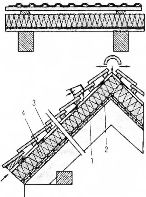 1 — подкровельная гидроизоляция: 2 — контробрешетка; 3 — теплоизоляция; 4 — паронепроницаемый слой. Стрелками показано движение воздуха.